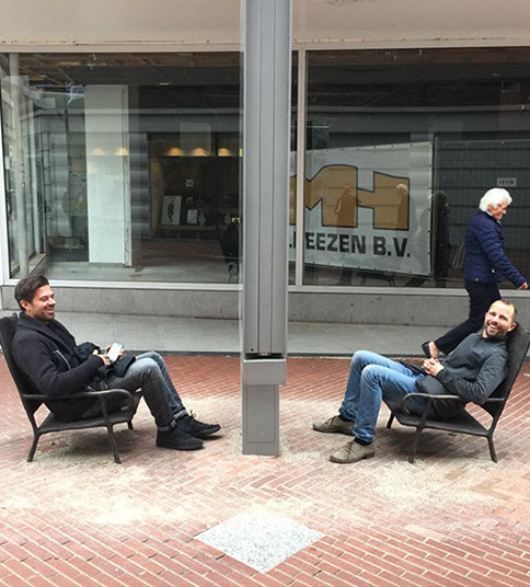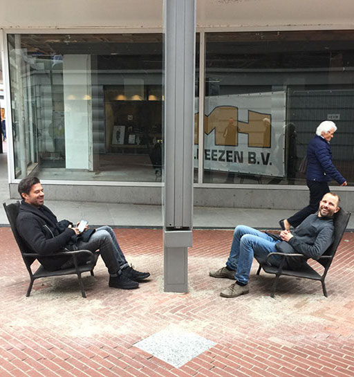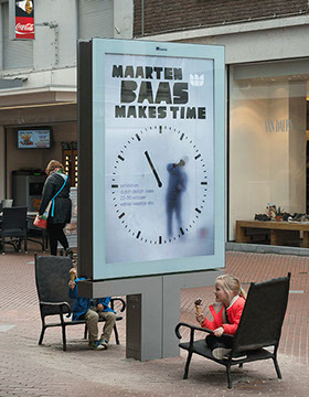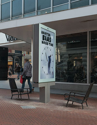 “Het gaat om de spanning tussen kunst en commercie”, zegt Maarten Baas over zijn bijdrage aan de RoundAbout Design Route die geopend wordt tijdens de Dutch Design Week (DDW). Dat spanningsveld verbeeldt de designer met een abri. Aan weerszijden van de ouderwetse reclamezuil staan twee bronzen zetels, gemaakt door stichting Beeldenstorm in Eindhoven.
