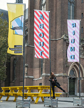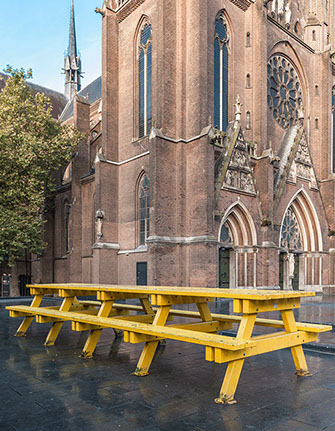 DDW bezoekers kunnen een plaats nemen aan de picnic tafel aan de voorkant van de kerk aan de Catharinaplein in Eindhoven. Echter moeten ze hun uiterste best hiervoor doen aangezien de tafel 8 meter lang, 2,5 meter breed en 1,5 meter hoog is.